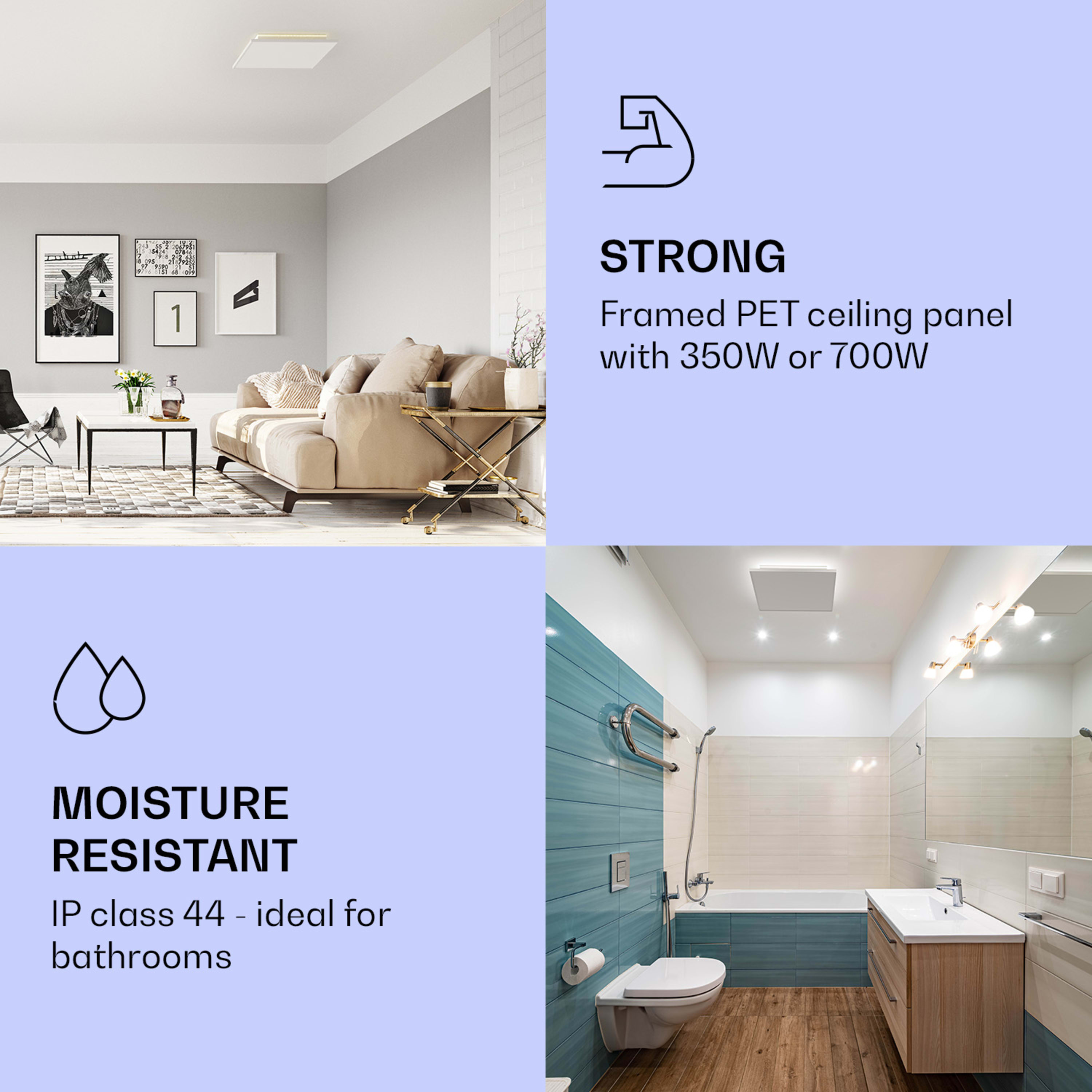 Poput tople sunčeve svjetlosti odozgo: Genijalni Wondersky stropni infracrveni grijač iz Klarsteina ima dvostruki učinak na vaše blagostanje. Obje ploče za stropno grijanje ujedno su ugodan izvor topline i svjetlosti. Dok vas umirujuće infracrveno zračenje grije, također možete odabrati hoće li vaša soba biti obavijena toplim ili hladnim svjetlom. U tu svrhu ravna ploča za grijanje ima integrirano pozadinsko osvjetljenje koje magično prodire kroz uski razmak između ploče i stropa. Ekskluzivna infracrvena grijalica koja se montira na strop je jednostavna i nenametljiva, ali ima odličan učinak. Možete ga kontrolirati vanjskim bežičnim termostatom i, zahvaljujući tjednom mjeraču vremena, unaprijed programirati njegovu funkciju prema vašim potrebama za toplinom i svjetlom.